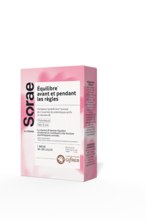 SORAE equilibre avant et pendant les règles est un complément alimentaire contenant un complexe de Probiotiques SynbÆctive® et Vitamine B1 pour accompagner les femmes pendant leurs menstruations et les phases sensibles du cycle.